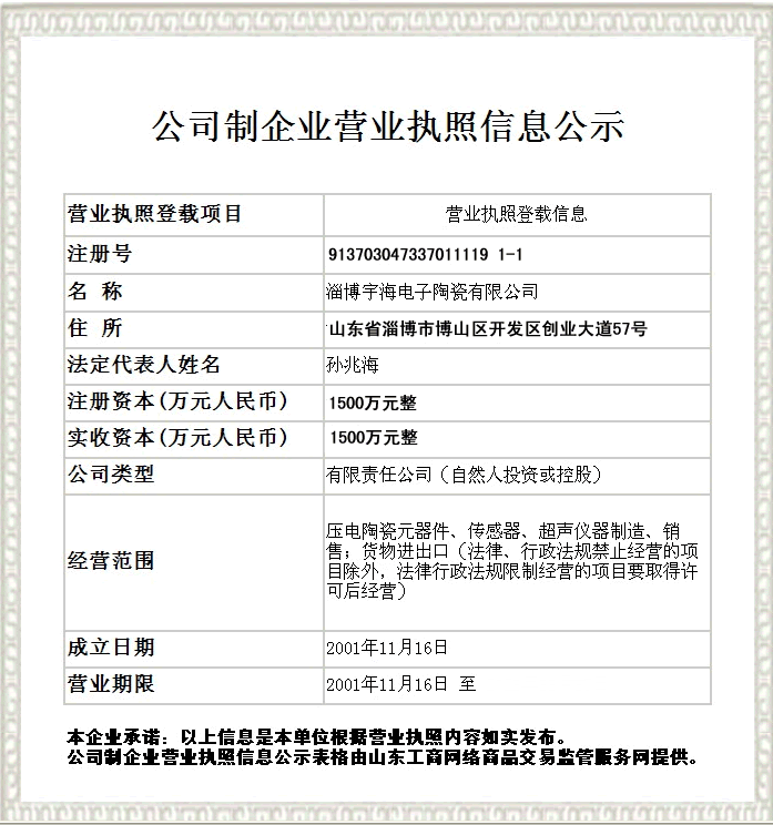 淄博宇海電子陶瓷有限公司位于淄博市博山開發區創業大道57號,始建于1966年,2001年11月由國營淄博無線電瓷件廠改制為淄博宇海電子陶瓷有限公司。公司是生產壓電陶瓷元件的專業廠家,是中國電子元件行業協會創始會員、山東省先進陶瓷創新創業共同體理事單位。